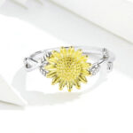 Bague Tournesol en argent 925 plaqué or blanc ajustable avec pétales plaqués or jaune