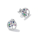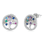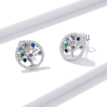 Boucles d’Oreilles Arbre de Vie Puces en Argent Sterling 925 plaqué or blanc avec pavé de zircons colorés