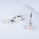 Boucles d’Oreilles Créoles Pendentif Perles, en argent 925 plaqué or blanc avec zircons blancs.
