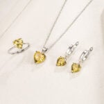 Parure de Bijoux Coeur, collier, boucles d’oreilles et bague ajustable en argent 925 plaqué or blanc avec zircons jaunes.