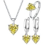 Parure de Bijoux Coeur Argent Sterling 925 plaqué or blanc avec collier, boucles d’oreilles et bague ajustable avec zircons jaunes
